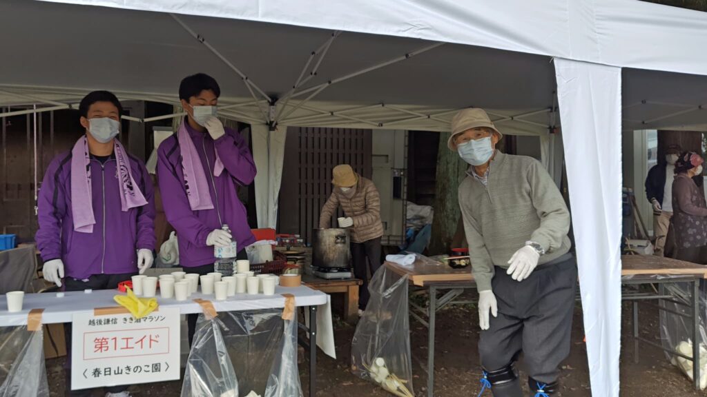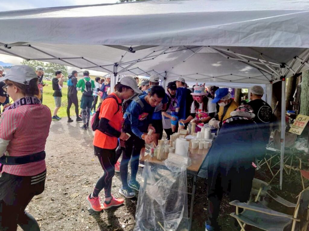 今回も越後まほろば倶楽部メンバー有志が第1エイドとして春日山きのこ園できのこ汁を提供しました。