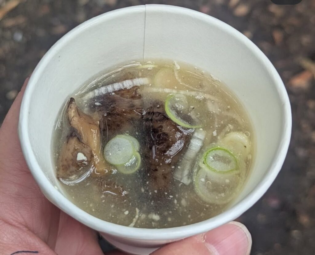 できるだけお待たせしないよう倶楽部員は一生懸命にきのこ汁を紙コップによそいました。