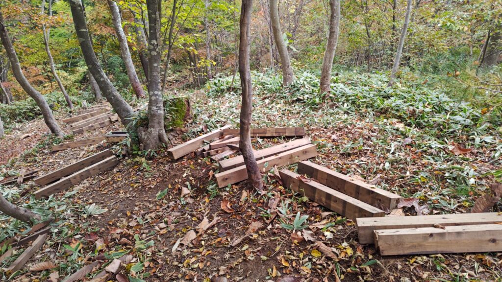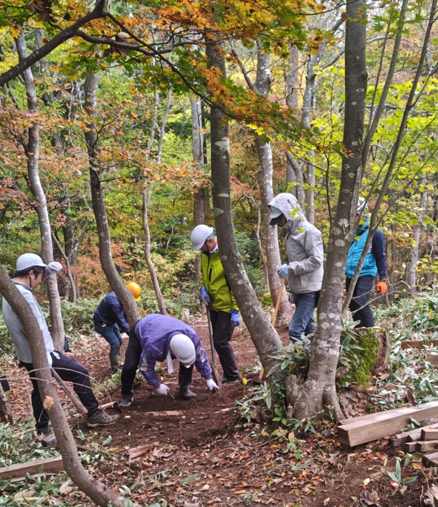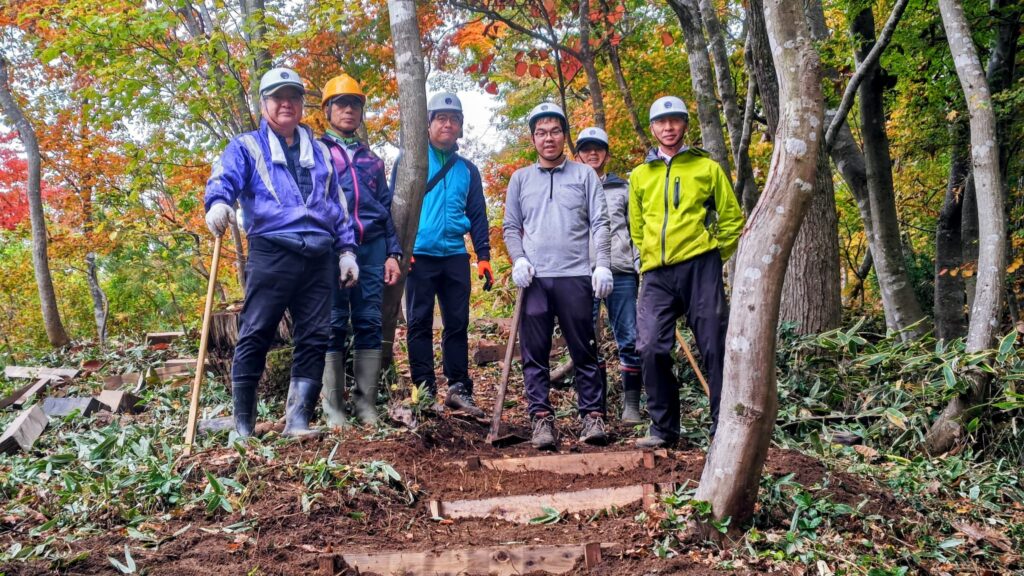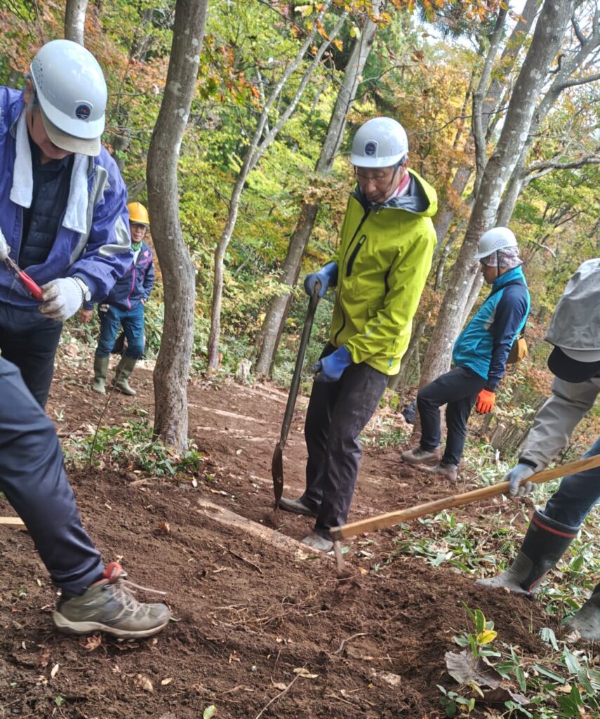 倶楽部では春日山城跡内の古道をたくさんの方から安全に体験していただきたいという思いから日常的に整備を行っていますが、今回はこの活動に興味をもっていただいた倶楽部員以外の方を交えて階段を作りました。