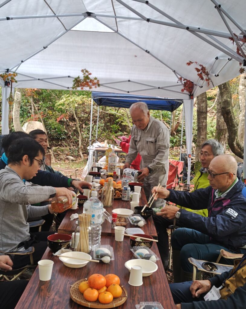 謙信公の「情の塩」に因んだ義の塩むすびと姫筍や豆腐、猪肉など具だくさんの天然きのこ汁、朝から薪ストーブの上で焼いた採れたて椎茸などをいただきながら交流を深めました。