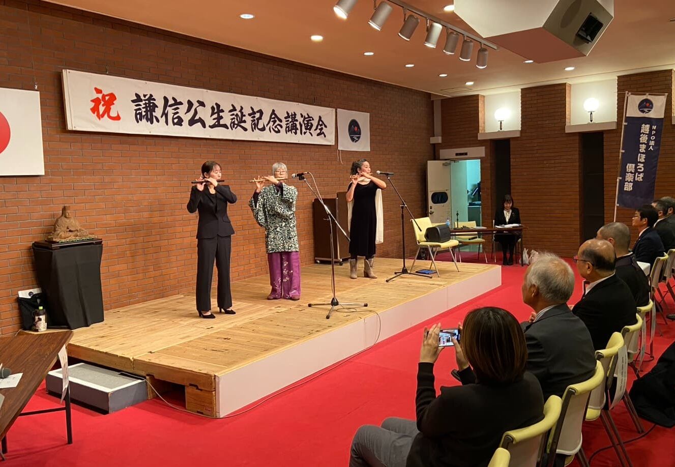 休憩後の第2部は、謙信公祭でもご披露いただいた「謙信公ばやし」、東日本大震災からの復興支援ソングである「花は咲く」、謙信公ばやし同様に狩野泰一氏が作曲された元気の出る曲「MATSURI」の篠笛演奏に始まり、参加者一同による春日村歌と続きました。
